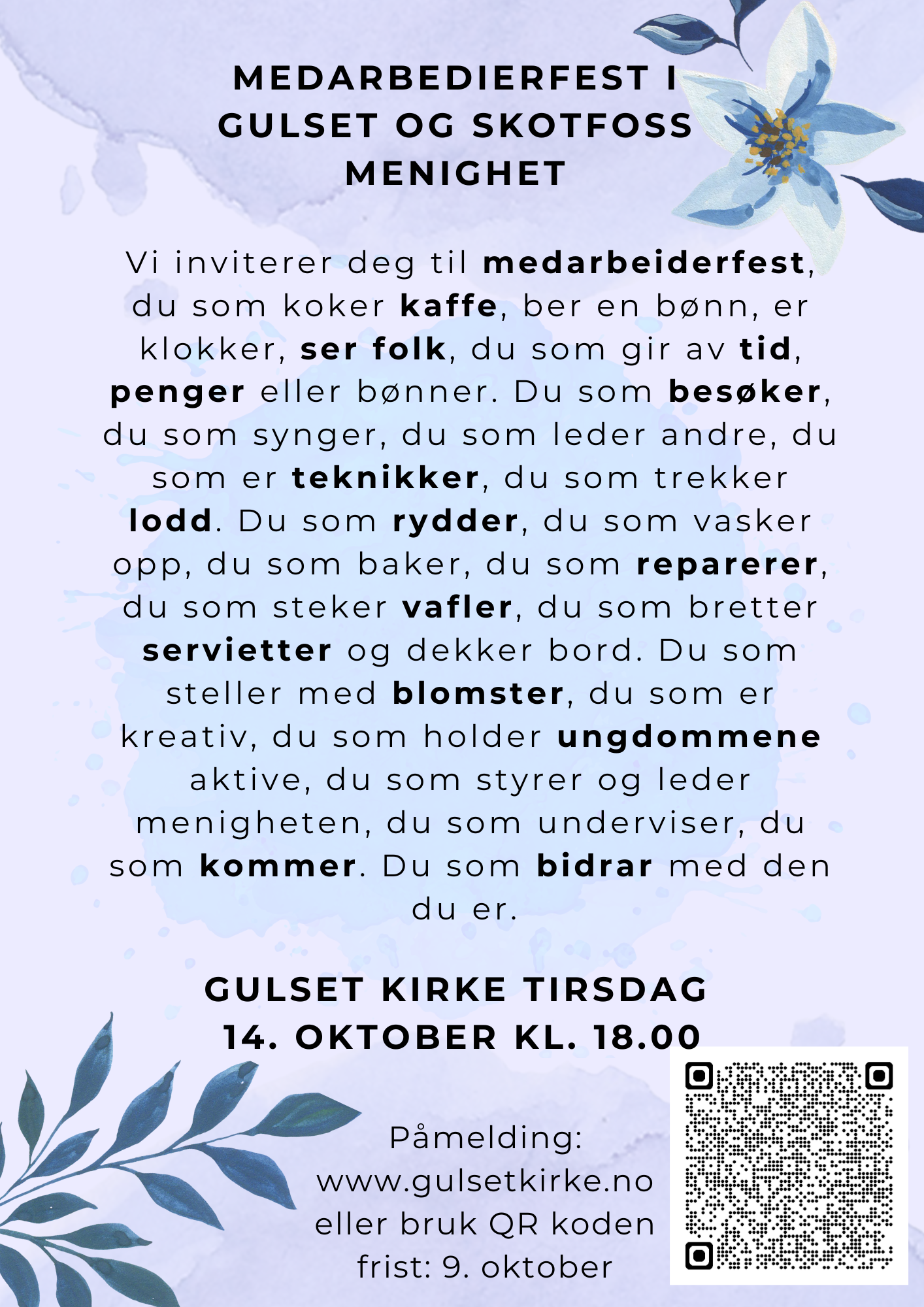 Vi inviterer deg til medarbeiderfest, du som koker kaffe, ber en bønn, er klokker, ser folk, du som gir av tid, penger eller bønner. Du som besøker, du som synger, du som leder andre, du som er teknikker, du som trekker lodd. Du som rydder, du som vasker opp, du som baker, du som reparerer, du som steker vafler, du som bretter servietter og dekker bord. Du som steller med blomster, du som er kreativ, du som holder ungdommene aktive, du som styrer og leder menigheten, du som underviser, du som kommer. Du som bidrar med den du er.