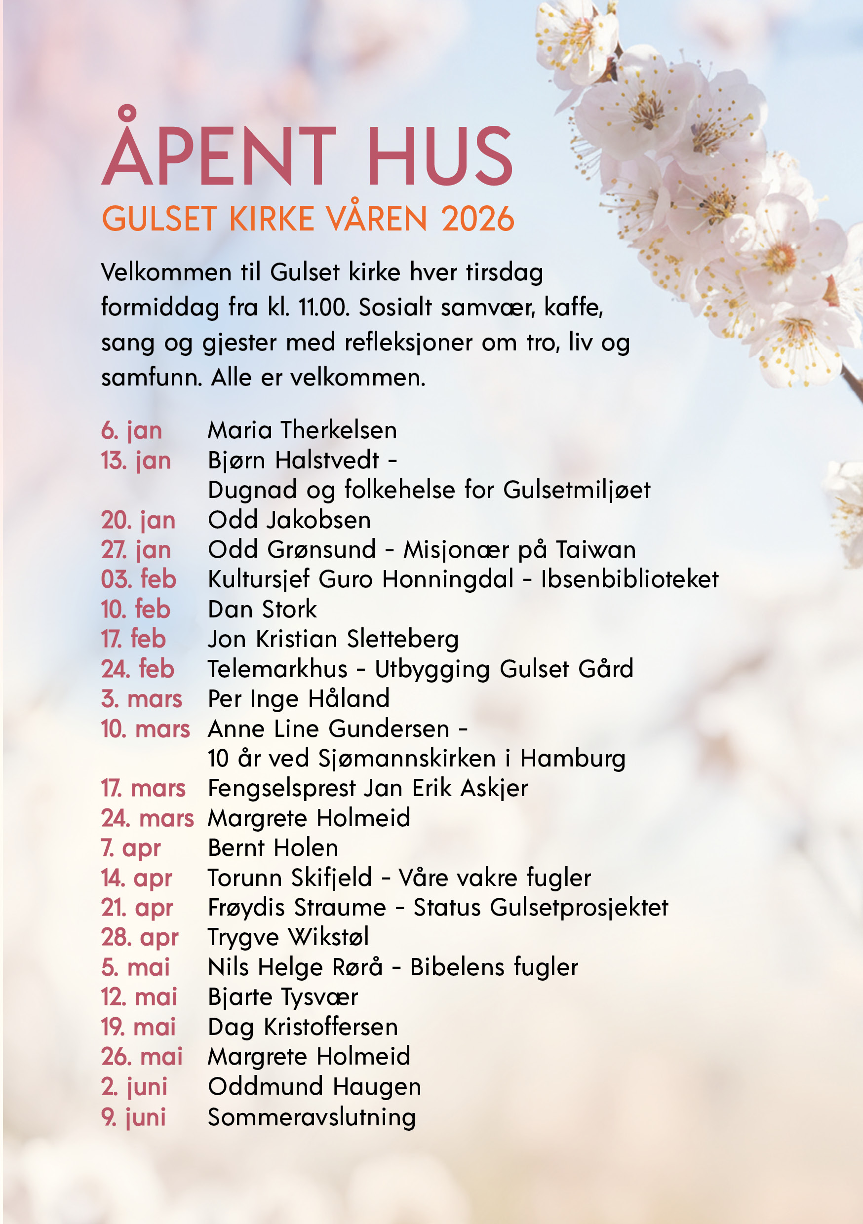 Åpent hus starter opp med sine ordinære samlinger tirsdag 6 januar Velkommen til sosialt samvær, kaffe, sang og enkel bevertning. Gjester m...